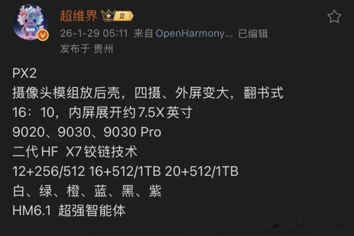 颜色可能有白色、绿色、橙色、蓝色、黑色和紫色,并搭载HarmonyOS 6.1系统及小艺智能助手。目前尚不清楚这些爆料有多少会成为现实。因此,我们暂且对这些信息持保留态度。